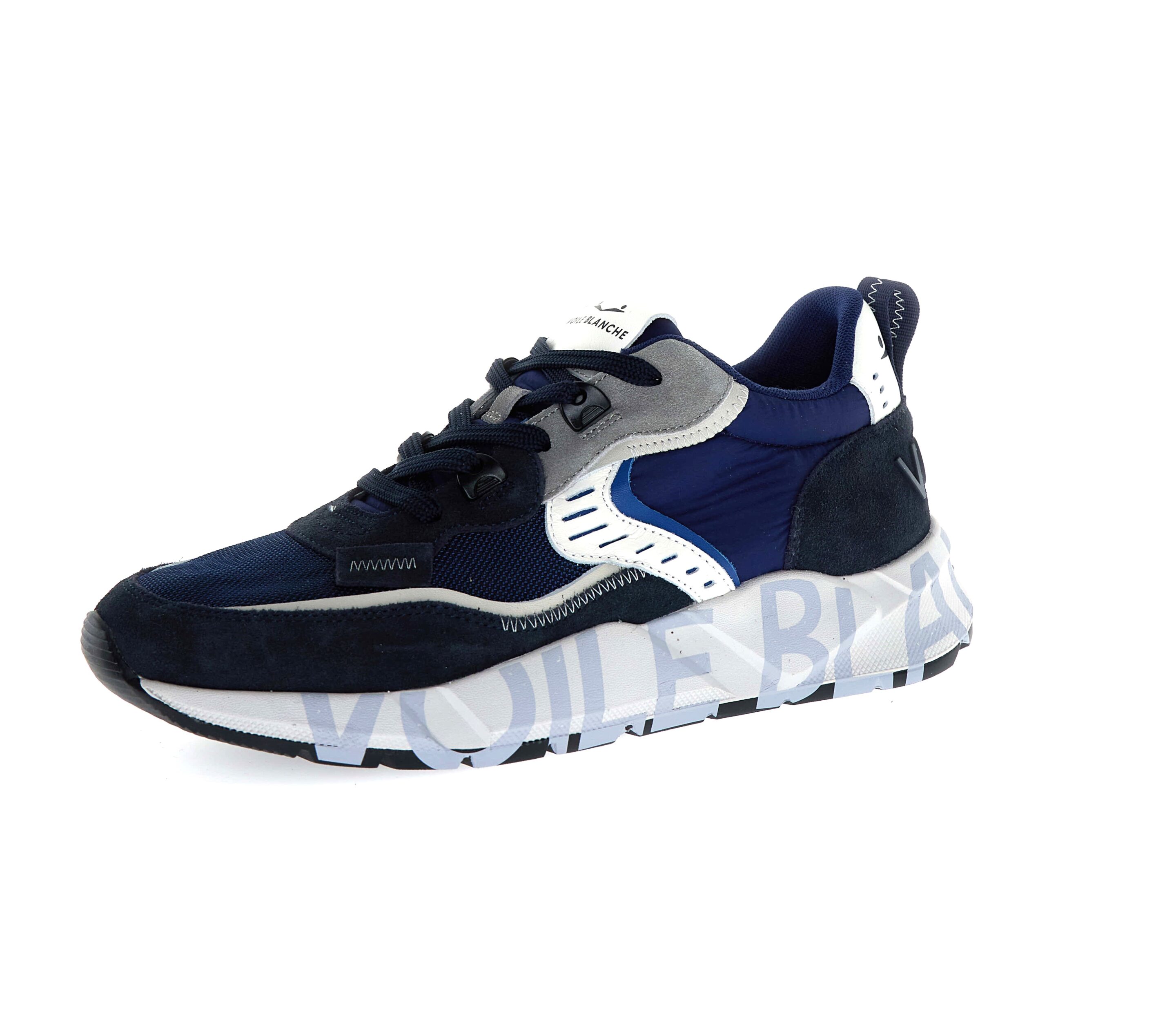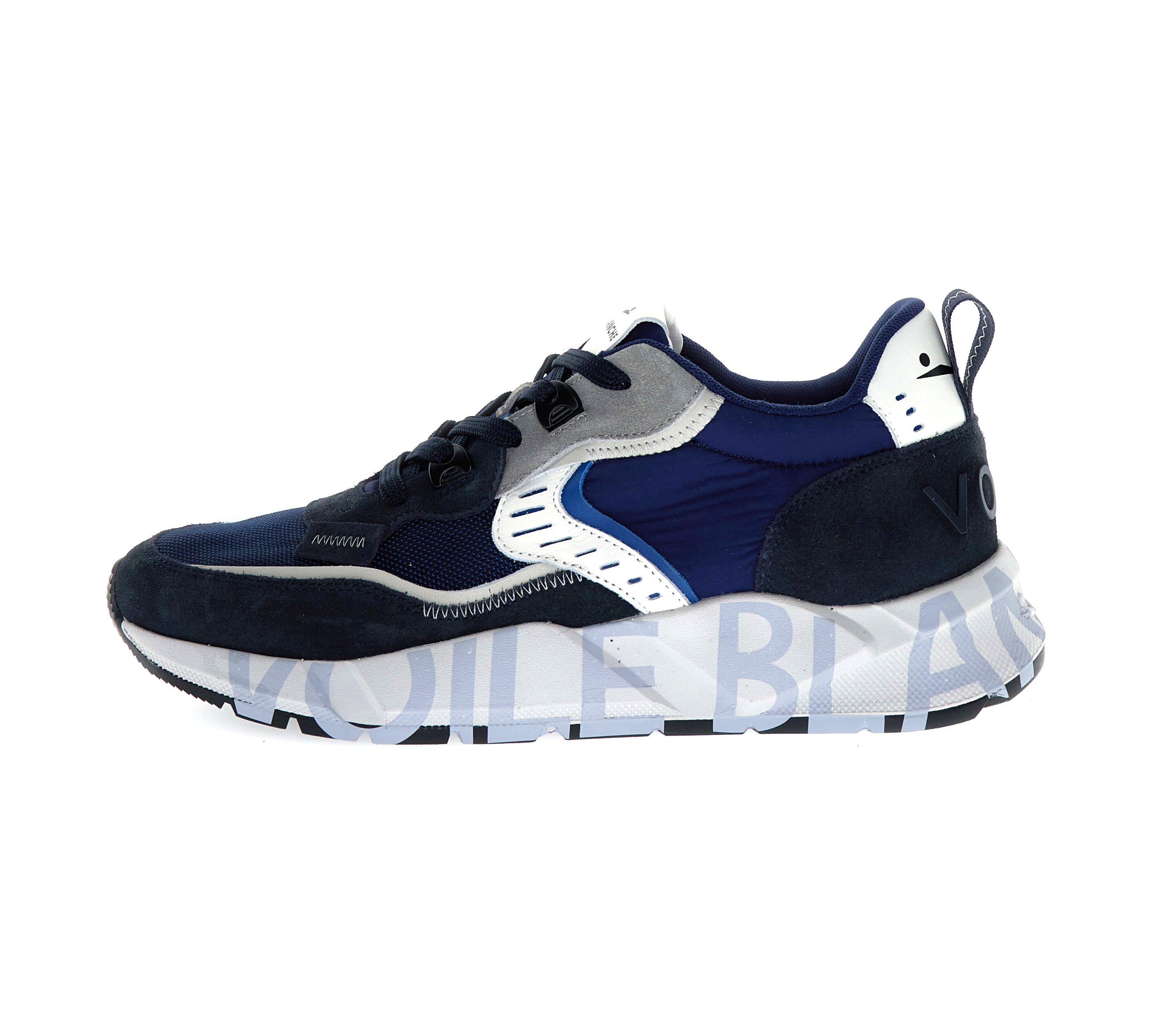 Leggera, dinamica, cool: la sneaker da città incontra lo stile unico di Voile Blanche, dando vita ad un modello ispirato ai modelli running. La tomaia in tessuto tecnico e suede gioca con le tonalità metropolitane, ritmate da traforature, impunture a vista e inserti a contrasti. Il logo tridimensionale sul tallone accendono l’energia di un modello completato da suola bold in gomma ultra leggera, con stampa serigrafata sul bordo.