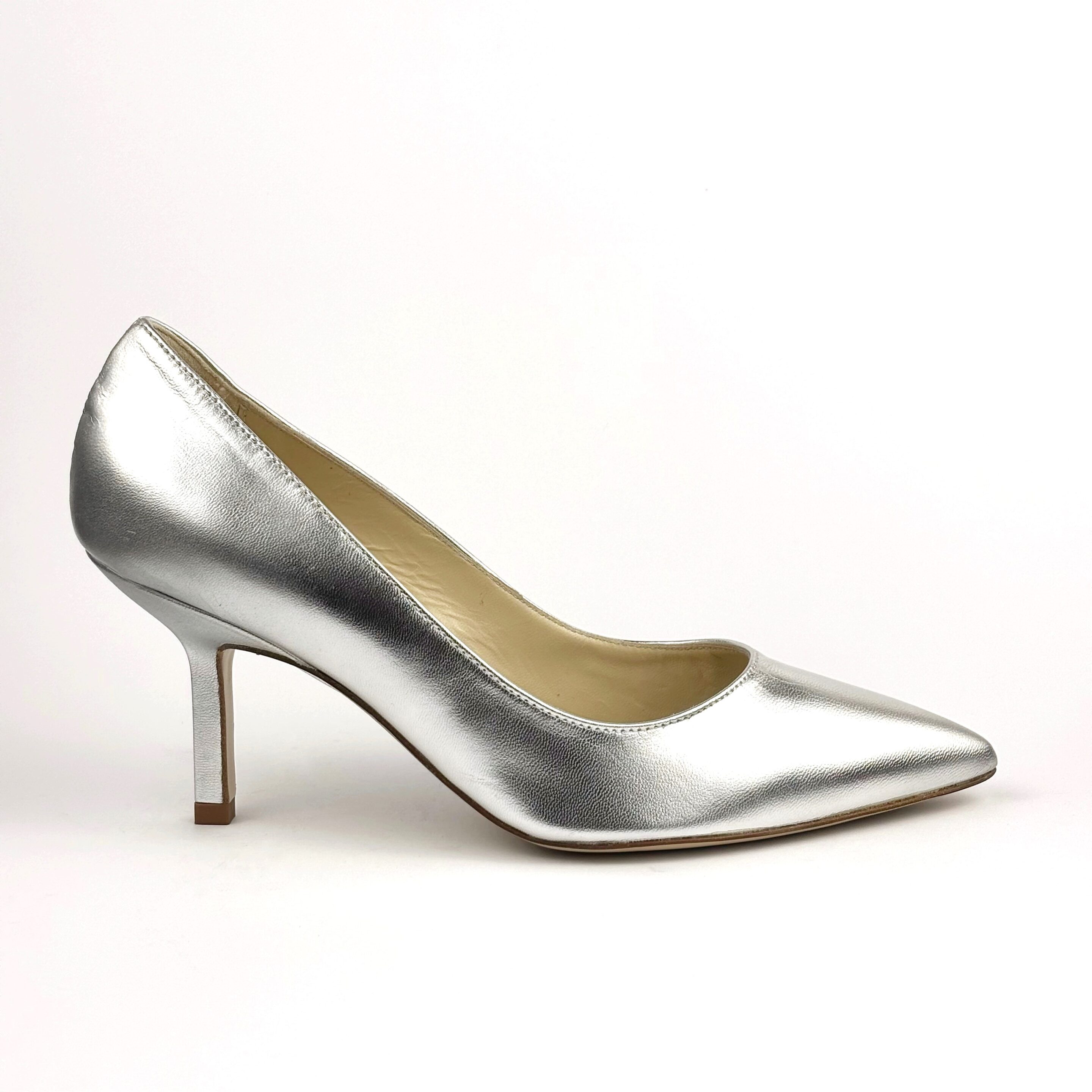 Décolleté elegante in pelle laminata argento, realizzata artigianalmente nelle Marche. Modello classico con punta affusolata e tacco medio sottile, ideale per cerimonie, eventi o look da sera. Fondo in vero cuoio per comfort, qualità e lunga durata. Uno stile raffinato 100% Made in Italy.